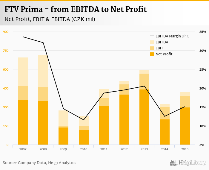 FTV Prima made a net profit of CZK 298 mil with revenues of CZK 2,796 mil in 2015, up by 48.2% and up by 6.66%, respectively, compared to the previous year. This translates into a net margin of 10.7%.