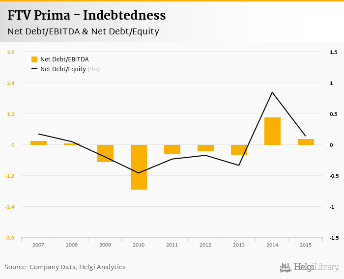 FTV Prima's net debt stood at CZK 94.6 mil and accounted for 0.132 of equity at the end of 2015. The ratio is down 0.709 pp compared to the previous year.