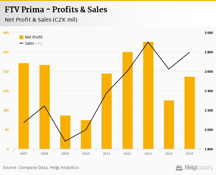 FTV Prima made a net profit of CZK 298 mil in 2015, up 48.2% compared to the previous year. Total sales reached CZK 2,796 mil, which is up 6.66% when compared to the previous year.