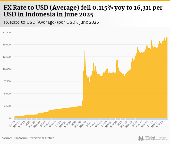 Average FX rate to USD fell 0.115% yoy to 16,311 per USD in Indonesia in June 2025, according to the National Statistical Office. This is 0.792% less than in the previous month.
