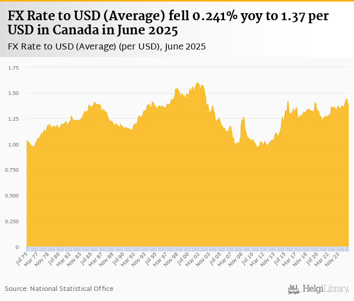 Average FX rate to USD fell 0.241% yoy to 1.37 per USD in Canada in June 2025, according to the National Statistical Office. This is 1.48% less than in the previous month.