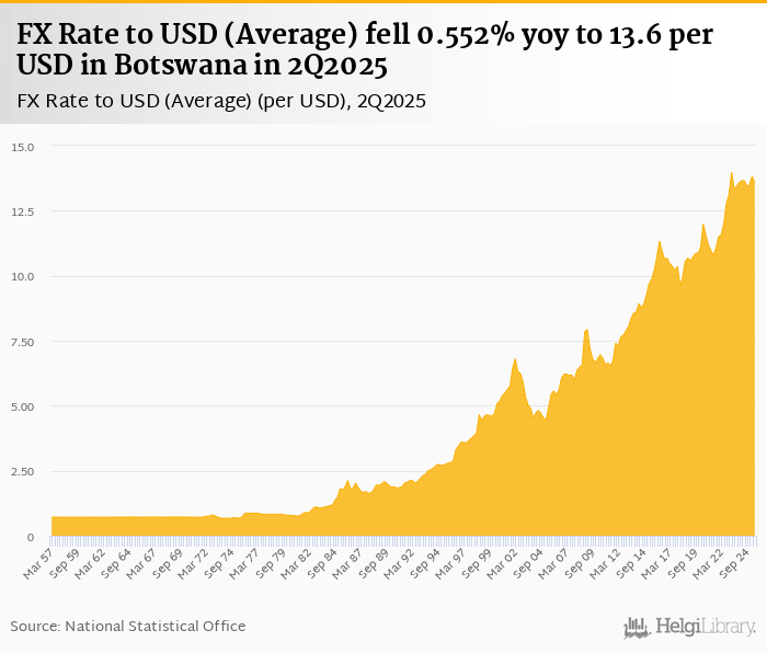 Average FX rate to USD fell 0.552% yoy to 13.6 per USD in Botswana in 2Q2025, according to the National Statistical Office. This is 1.79% less than in the previous quarter.