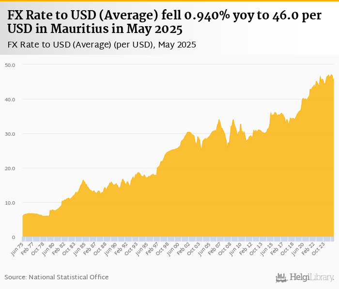 Average FX rate to USD fell 0.940% yoy to 46.0 per USD in Mauritius in May 2025, according to the National Statistical Office. This is 1.77% more than in the previous month.