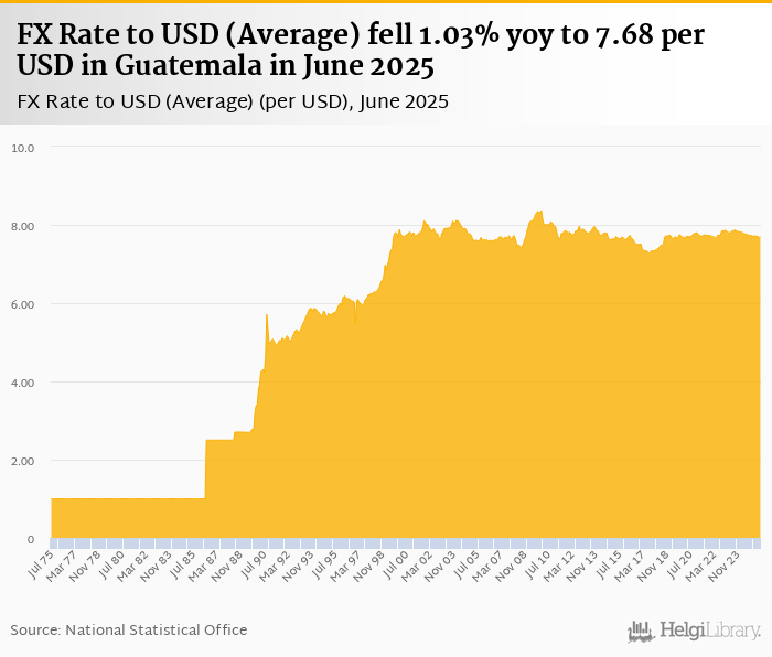 Average FX rate to USD fell 1.03% yoy to 7.68 per USD in Guatemala in June 2025, according to the National Statistical Office. This is 0.117% more than in the previous month.