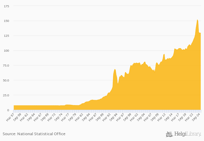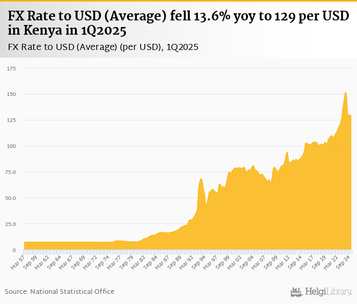 Average FX rate to USD fell 13.6% yoy to 129 per USD in Kenya in 1Q2025, according to the National Statistical Office. This is 0.017% more than in the previous quarter.