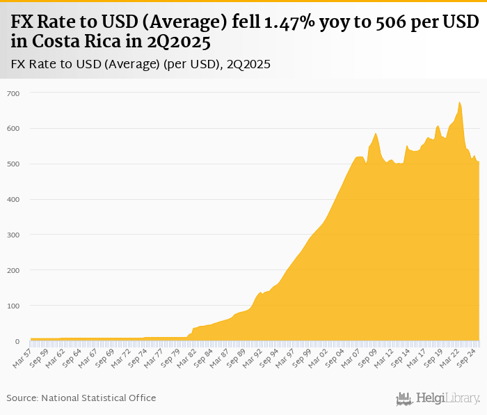 Average FX rate to USD fell 1.47% yoy to 506 per USD in Costa Rica in 2Q2025, according to the National Statistical Office. This is 0.222% more than in the previous quarter.
