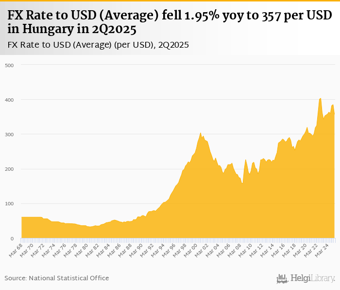 Average FX rate to USD fell 1.95% yoy to 357 per USD in Hungary in 2Q2025, according to the National Statistical Office. This is 7.37% less than in the previous quarter.