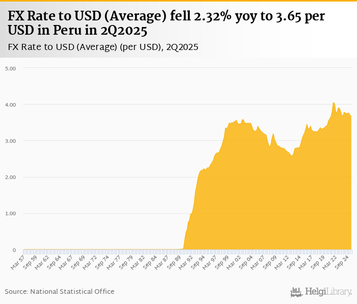 Average FX rate to USD fell 2.32% yoy to 3.65 per USD in Peru in 2Q2025, according to the National Statistical Office. This is 1.26% less than in the previous quarter.