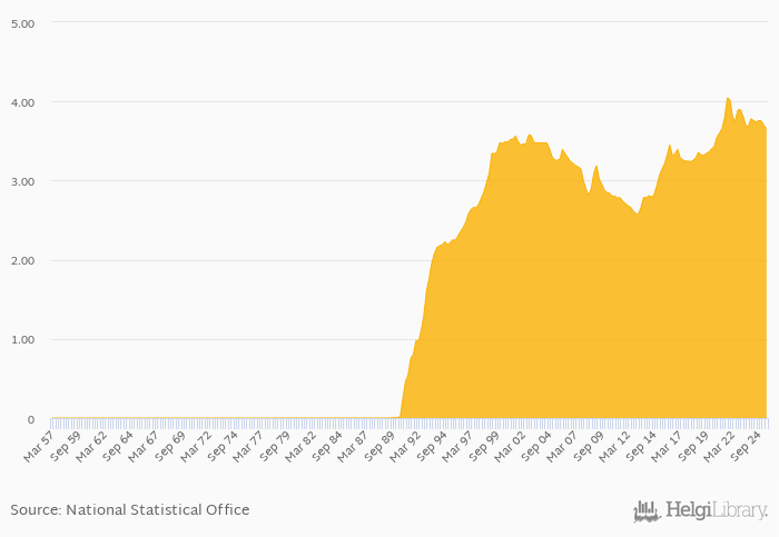 Historically, Average FX rate to USD in Peru reached an all time high of 4.04 per USD in 3Q2021 and an all time low of < 0.001 per USD in 1Q1957.
