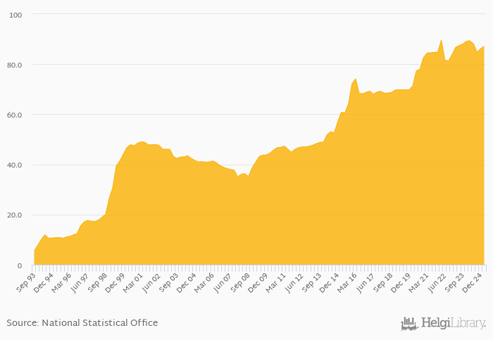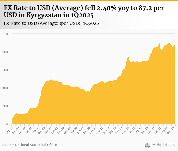 Average FX rate to USD fell 2.40% yoy to 87.2 per USD in Kyrgyzstan in 1Q2025, according to the National Statistical Office. This is 1.22% more than in the previous quarter.