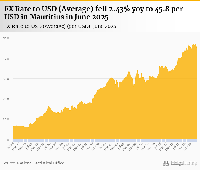 Average FX rate to USD fell 2.43% yoy to 45.8 per USD in Mauritius in June 2025, according to the National Statistical Office. This is 0.503% less than in the previous month.
