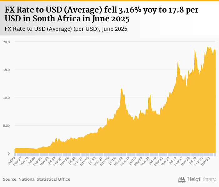 Average FX rate to USD fell 3.16% yoy to 17.8 per USD in South Africa in June 2025, according to the National Statistical Office. This is 1.47% less than in the previous month.