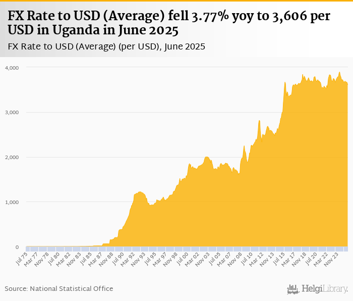 Average FX rate to USD fell 3.77% yoy to 3,606 per USD in Uganda in June 2025, according to the National Statistical Office. This is 1.30% less than in the previous month.