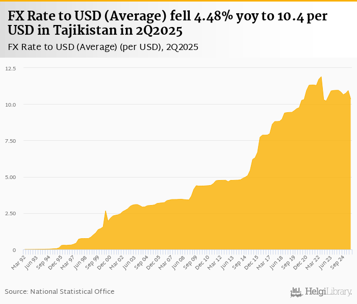 Average FX rate to USD fell 4.48% yoy to 10.4 per USD in Tajikistan in 2Q2025, according to the National Statistical Office. This is 5.34% less than in the previous quarter.