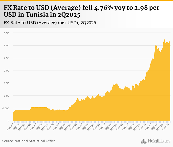 Average FX rate to USD fell 4.76% yoy to 2.98 per USD in Tunisia in 2Q2025, according to the National Statistical Office. This is 5.70% less than in the previous quarter.