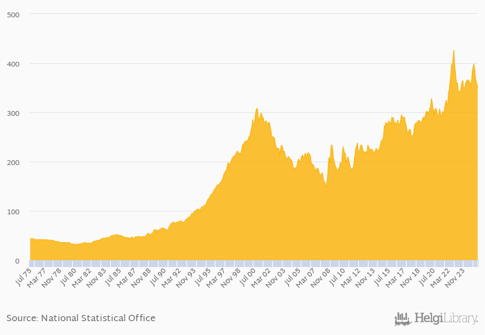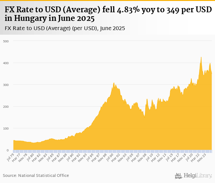 Average FX rate to USD fell 4.83% yoy to 349 per USD in Hungary in June 2025, according to the National Statistical Office. This is 2.56% less than in the previous month.