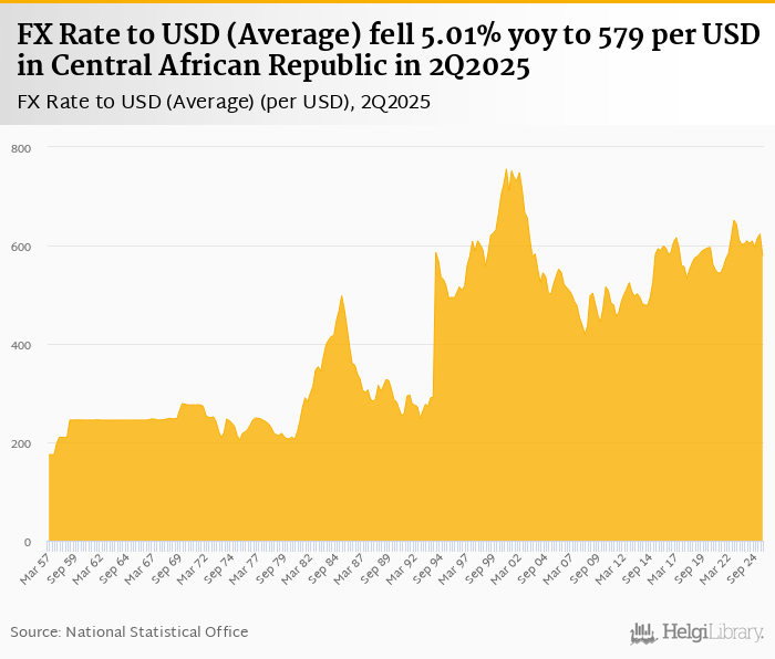 Average FX rate to USD fell 5.01% yoy to 579 per USD in Central African Republic in 2Q2025, according to the National Statistical Office. This is 7.18% less than in the previous quarter.