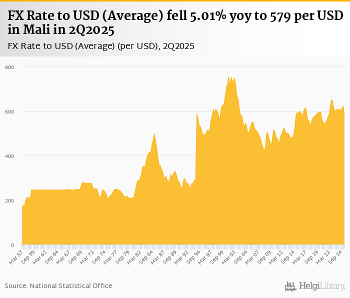 Average FX rate to USD fell 5.01% yoy to 579 per USD in Mali in 2Q2025, according to the National Statistical Office. This is 7.18% less than in the previous quarter.