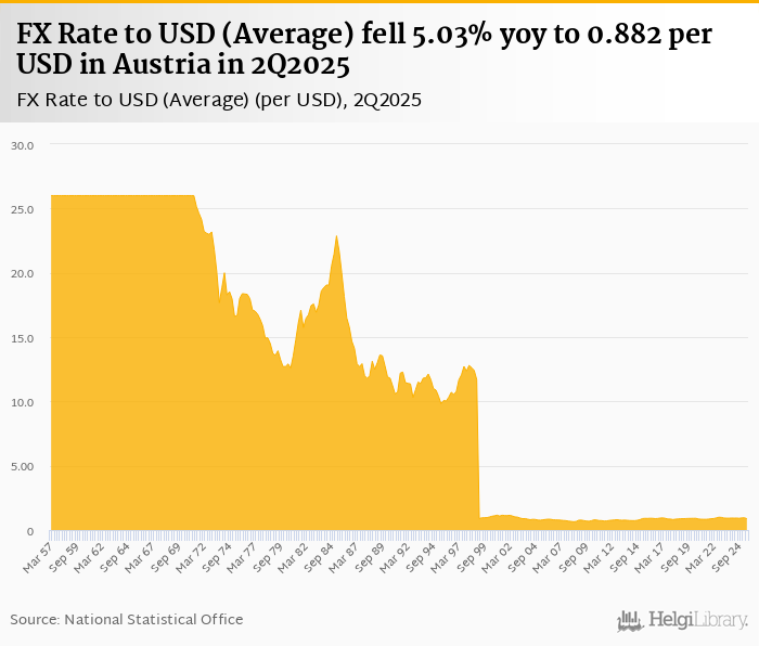 Average FX rate to USD fell 5.03% yoy to 0.882 per USD in Austria in 2Q2025, according to the National Statistical Office. This is 7.18% less than in the previous quarter.