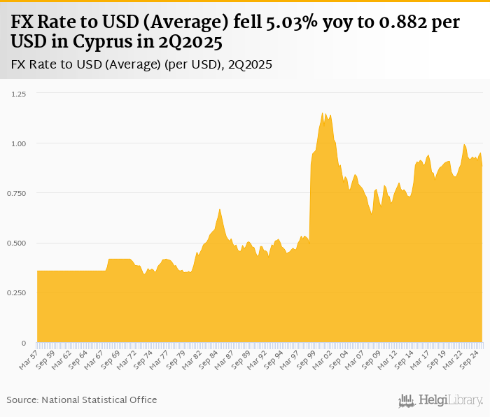 Average FX rate to USD fell 5.03% yoy to 0.882 per USD in Cyprus in 2Q2025, according to the National Statistical Office. This is 7.18% less than in the previous quarter.