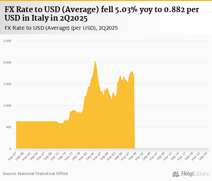 Average FX rate to USD fell 5.03% yoy to 0.882 per USD in Italy in 2Q2025, according to the National Statistical Office. This is 7.18% less than in the previous quarter.