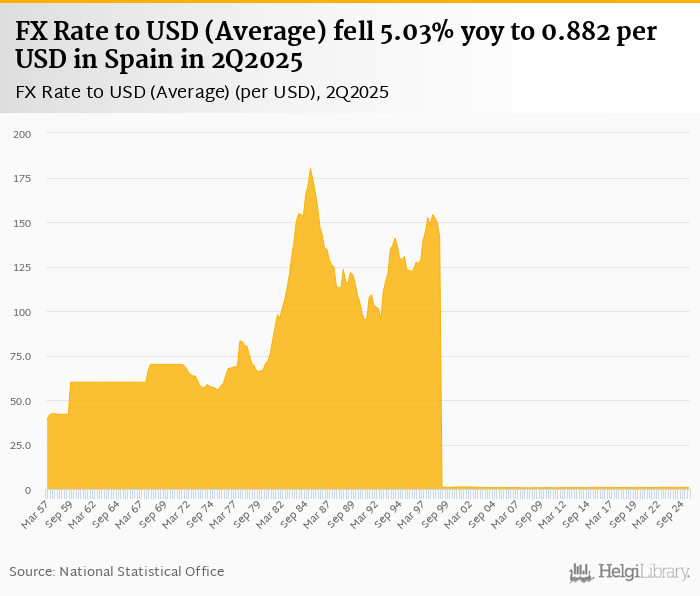 Average FX rate to USD fell 5.03% yoy to 0.882 per USD in Spain in 2Q2025, according to the National Statistical Office. This is 7.18% less than in the previous quarter.