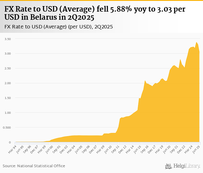 Average FX rate to USD fell 5.88% yoy to 3.03 per USD in Belarus in 2Q2025, according to the National Statistical Office. This is 8.25% less than in the previous quarter.