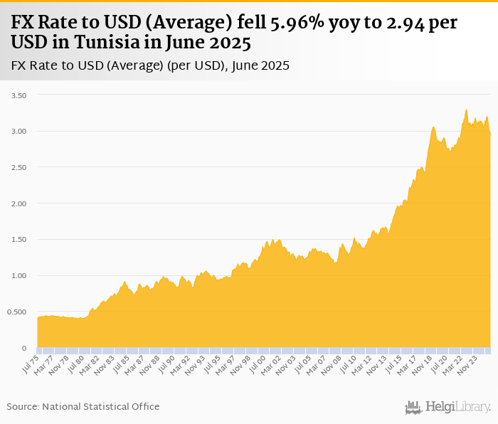 Average FX rate to USD fell 5.96% yoy to 2.94 per USD in Tunisia in June 2025, according to the National Statistical Office. This is 1.68% less than in the previous month.