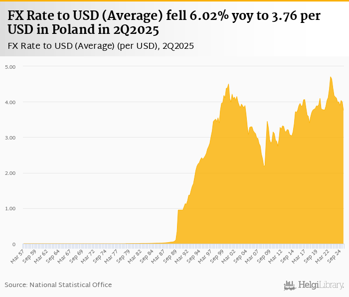 Average FX rate to USD fell 6.02% yoy to 3.76 per USD in Poland in 2Q2025, according to the National Statistical Office. This is 6.03% less than in the previous quarter.
