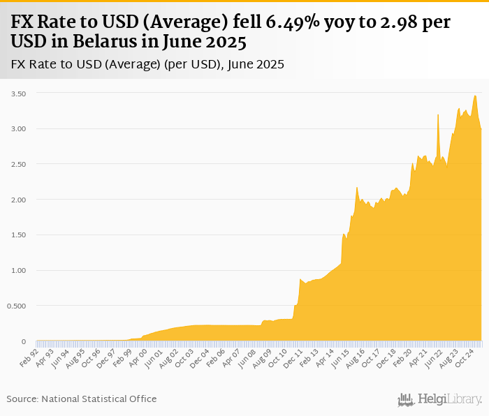 Average FX rate to USD fell 6.49% yoy to 2.98 per USD in Belarus in June 2025, according to the National Statistical Office. This is 1.01% less than in the previous month.