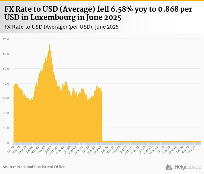 Average FX rate to USD fell 6.58% yoy to 0.868 per USD in Luxembourg in June 2025, according to the National Statistical Office. This is 2.07% less than in the previous month.