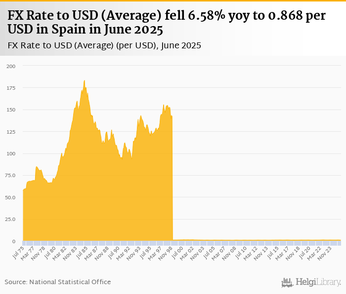 Average FX rate to USD fell 6.58% yoy to 0.868 per USD in Spain in June 2025, according to the National Statistical Office. This is 2.07% less than in the previous month.
