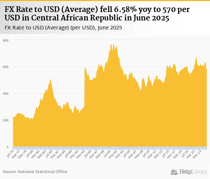 Average FX rate to USD fell 6.58% yoy to 570 per USD in Central African Republic in June 2025, according to the National Statistical Office. This is 2.07% less than in the previous month.