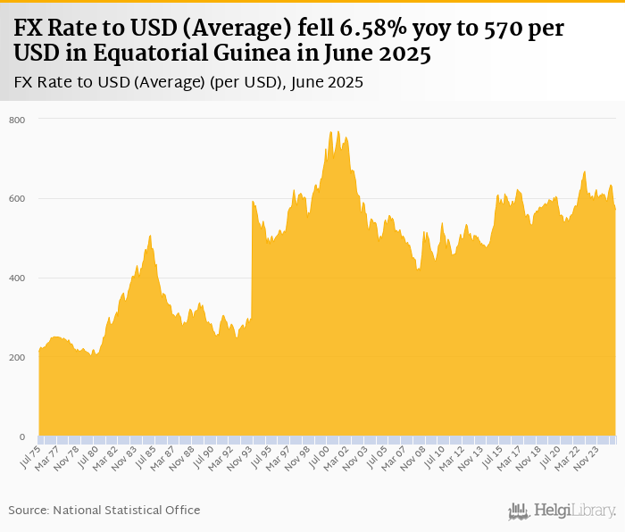 Average FX rate to USD fell 6.58% yoy to 570 per USD in Equatorial Guinea in June 2025, according to the National Statistical Office. This is 2.07% less than in the previous month.