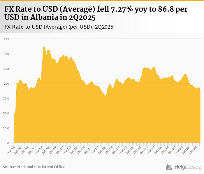 Average FX rate to USD fell 7.27% yoy to 86.8 per USD in Albania in 2Q2025, according to the National Statistical Office. This is 7.69% less than in the previous quarter.