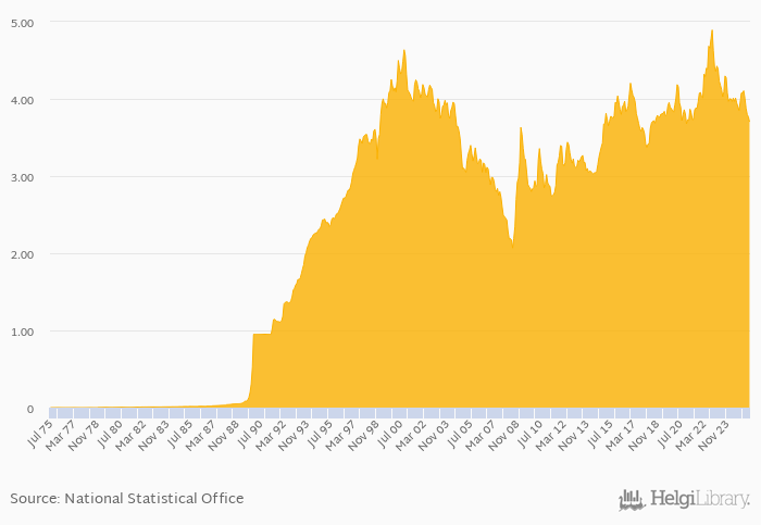 Historically, Average FX rate to USD in Poland reached an all time high of 4.89 per USD in October 2022 and an all time low of < 0.001 per USD in October 1973.