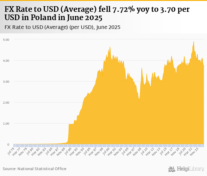 Average FX rate to USD fell 7.72% yoy to 3.70 per USD in Poland in June 2025, according to the National Statistical Office. This is 1.75% less than in the previous month.