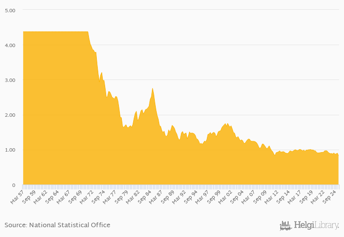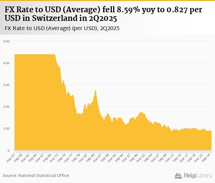 Average FX rate to USD fell 8.59% yoy to 0.827 per USD in Switzerland in 2Q2025, according to the National Statistical Office. This is 8.05% less than in the previous quarter.