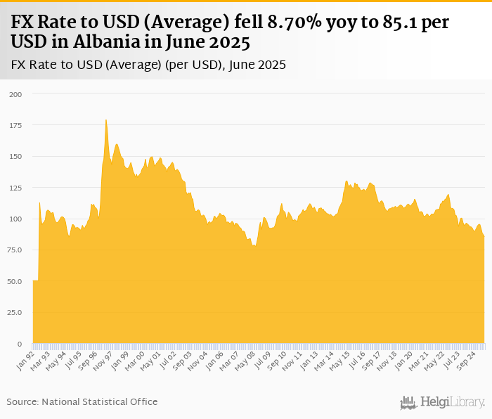 Average FX rate to USD fell 8.70% yoy to 85.1 per USD in Albania in June 2025, according to the National Statistical Office. This is 2.14% less than in the previous month.