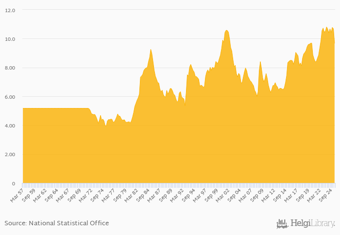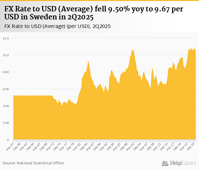 Average FX rate to USD fell 9.50% yoy to 9.67 per USD in Sweden in 2Q2025, according to the National Statistical Office. This is 9.50% less than in the previous quarter.