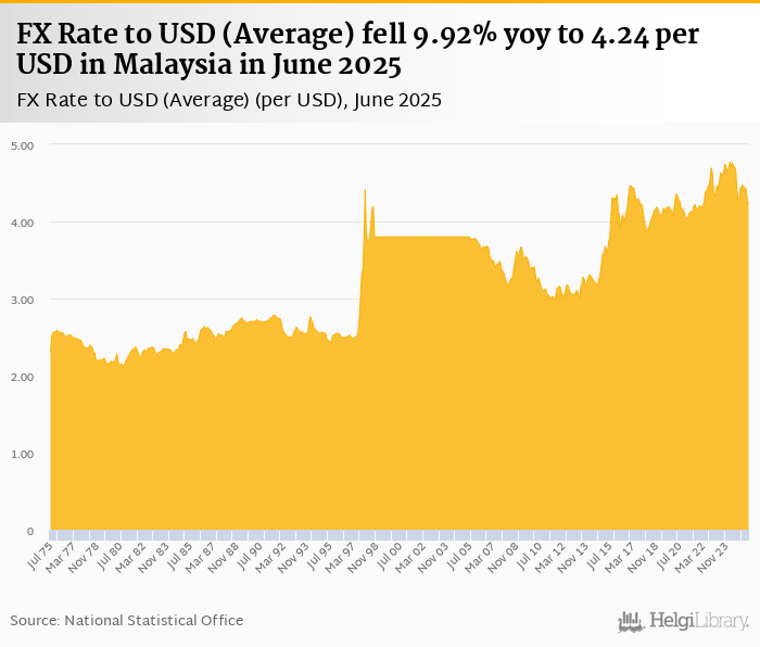 Average FX rate to USD fell 9.92% yoy to 4.24 per USD in Malaysia in June 2025, according to the National Statistical Office. This is 0.483% less than in the previous month.