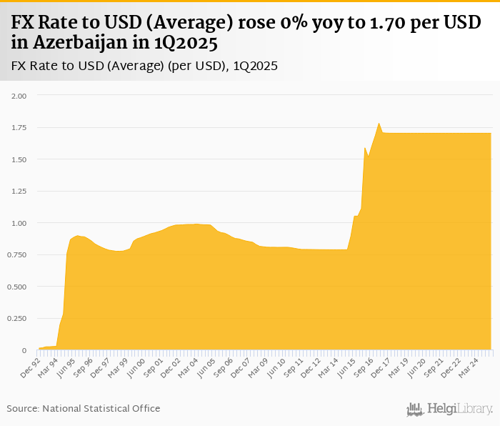 Average FX rate to USD rose 0% yoy to 1.70 per USD in Azerbaijan in 1Q2025, according to the National Statistical Office. This is 0% more than in the previous quarter.