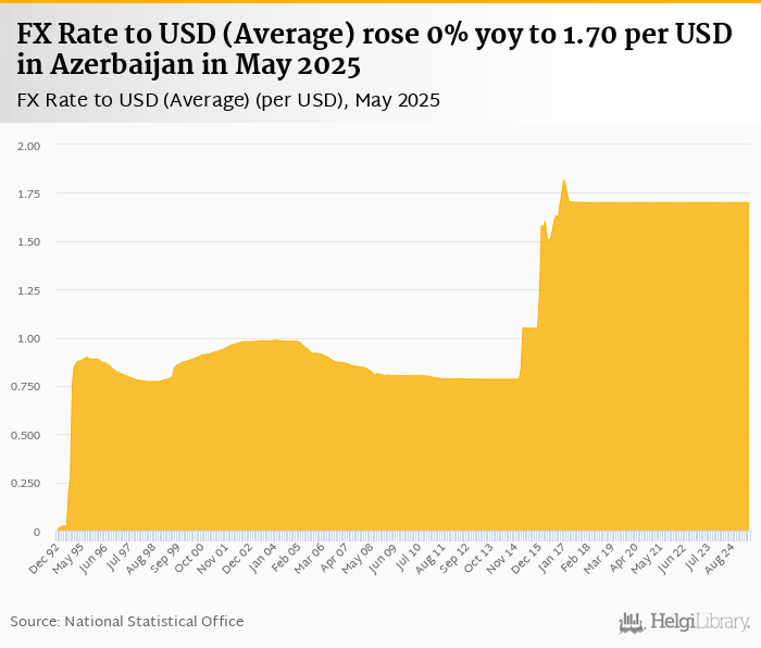 Average FX rate to USD rose 0% yoy to 1.70 per USD in Azerbaijan in May 2025, according to the National Statistical Office. This is 0% more than in the previous month.