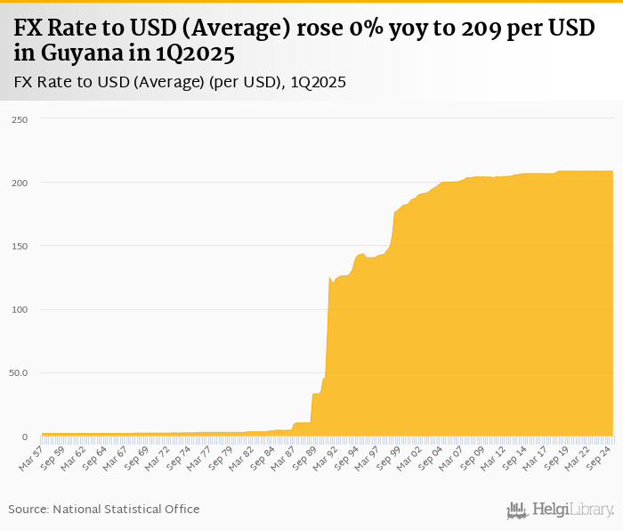 Average FX rate to USD rose 0% yoy to 209 per USD in Guyana in 1Q2025, according to the National Statistical Office. This is 0% more than in the previous quarter.