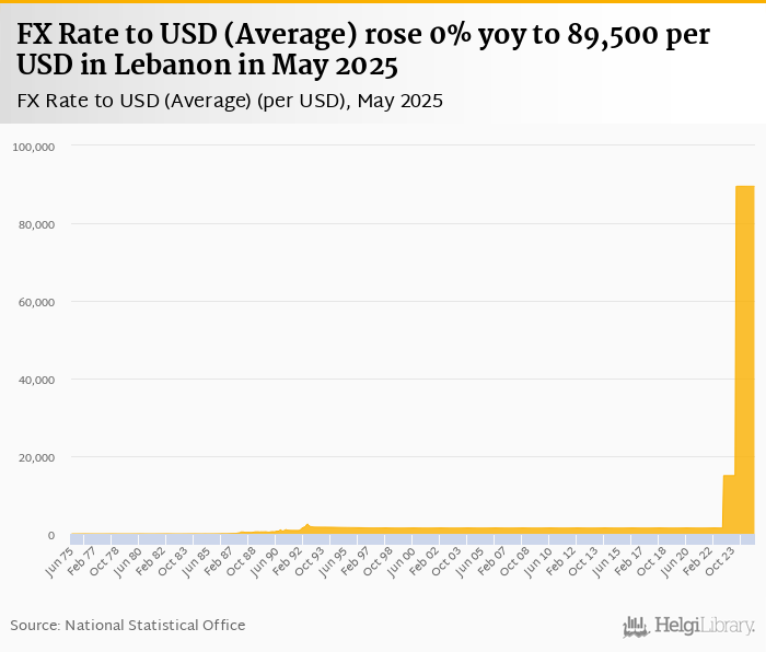 Average FX rate to USD rose 0% yoy to 89,500 per USD in Lebanon in May 2025, according to the National Statistical Office. This is 0% more than in the previous month.