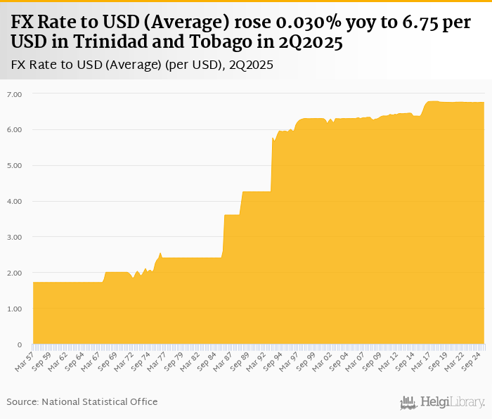 Average FX rate to USD rose 0.030% yoy to 6.75 per USD in Trinidad and Tobago in 2Q2025, according to the National Statistical Office. This is 0.035% less than in the previous quarter.