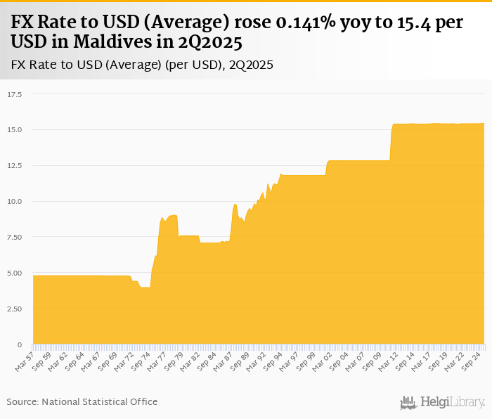 Average FX rate to USD rose 0.141% yoy to 15.4 per USD in Maldives in 2Q2025, according to the National Statistical Office. This is 0.023% more than in the previous quarter.
