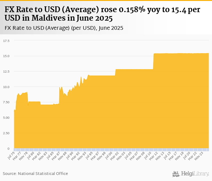 Average FX rate to USD rose 0.158% yoy to 15.4 per USD in Maldives in June 2025, according to the National Statistical Office. This is 0.016% more than in the previous month.