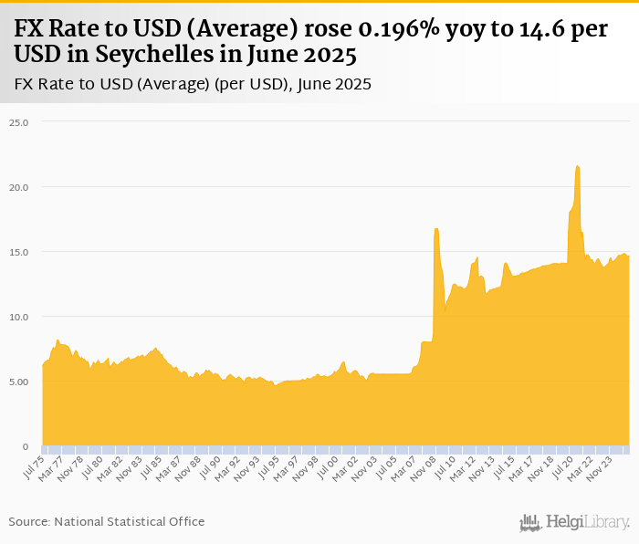 Average FX rate to USD rose 0.196% yoy to 14.6 per USD in Seychelles in June 2025, according to the National Statistical Office. This is 0.011% more than in the previous month.
