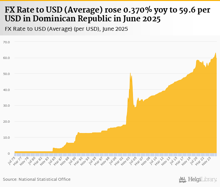 Average FX rate to USD rose 0.370% yoy to 59.6 per USD in Dominican Republic in June 2025, according to the National Statistical Office. This is 0.702% more than in the previous month.